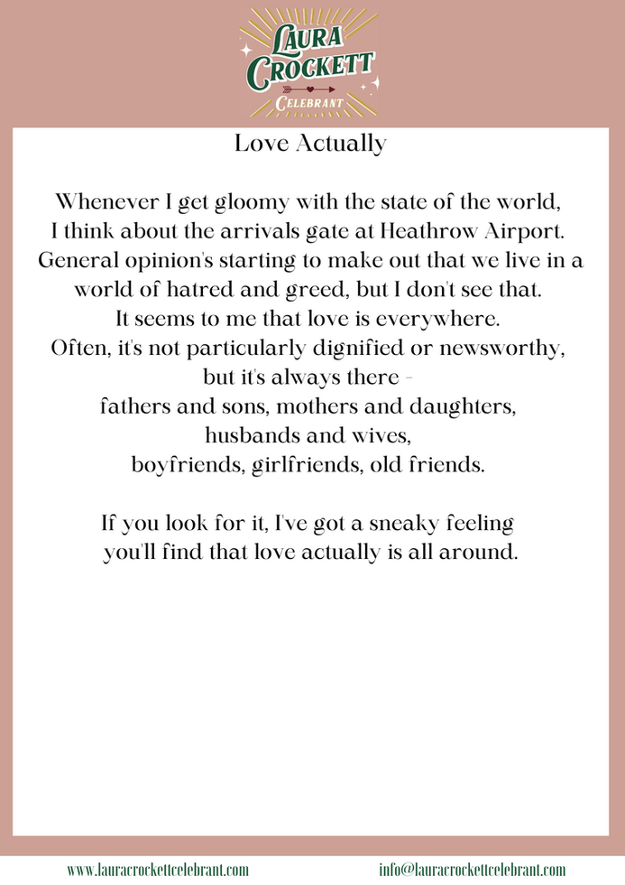 Next, find a selection of readings that align with your desired style (I have some examples below which are a great starting point). Read through them and think about how they make you feel. Remember, the initial emotion you feel when hearing a reading is likely what your guests will experience, too. Trust your instincts and choose the reading that gives you butterflies and feels truly 'you.'